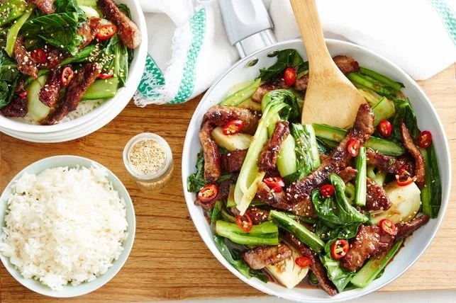 Step 2 - Wipe the wok or frying pan clean. Add the choy sum and pak choy. Stir-fry for 3 mins or until charred. Combine the honey, oyster sauce, soy sauce and lime juice in a small bowl. Add to the wok. Bring to a boil. Return beef to the wok. Cook for 2-3 mins or until sauce thickens. Add the chilli and toss to combine.