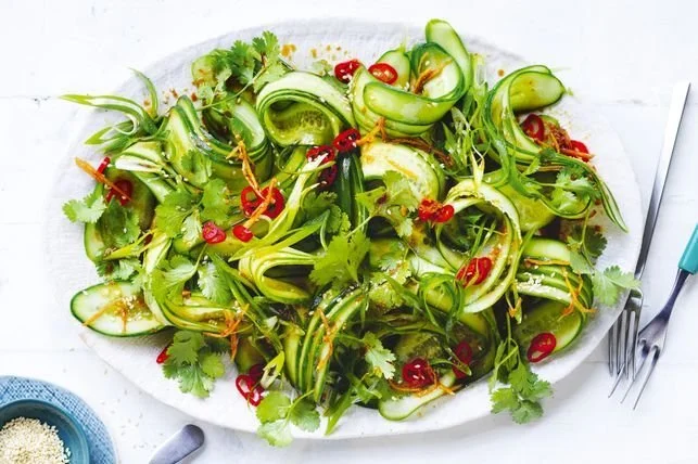Step 2 - Arrange the cucumber, spring onion, coriander and chilli, if using, on a serving platter. Drizzle with the dressing. Sprinkle with sesame seeds.
